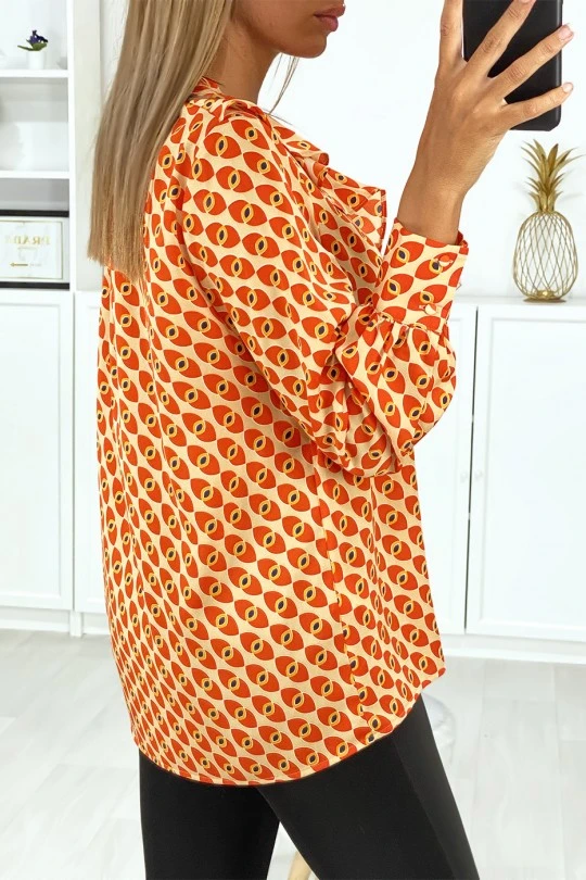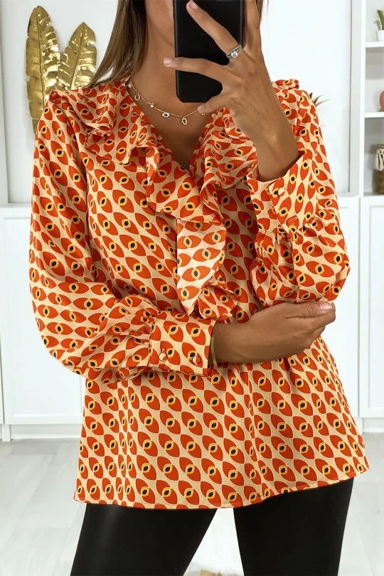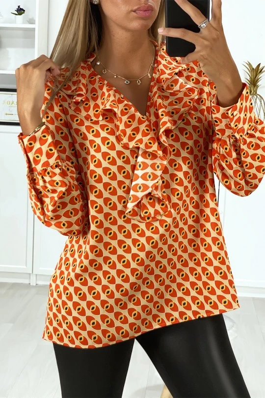 Blouse pour femme à motif orange avec volant à l’avant. Vêtement mode femme pas cher