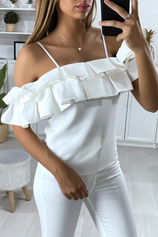 Blouse blanche pour femme col bateau avec volant en forme de plis. Mode femme pas cher