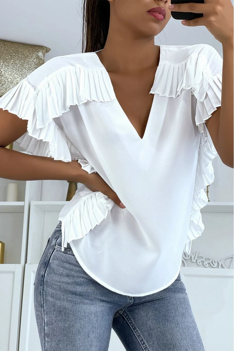 Blouse femme en blanche avec plissé aux épaules et sur les cotés. Vêtement mode femme