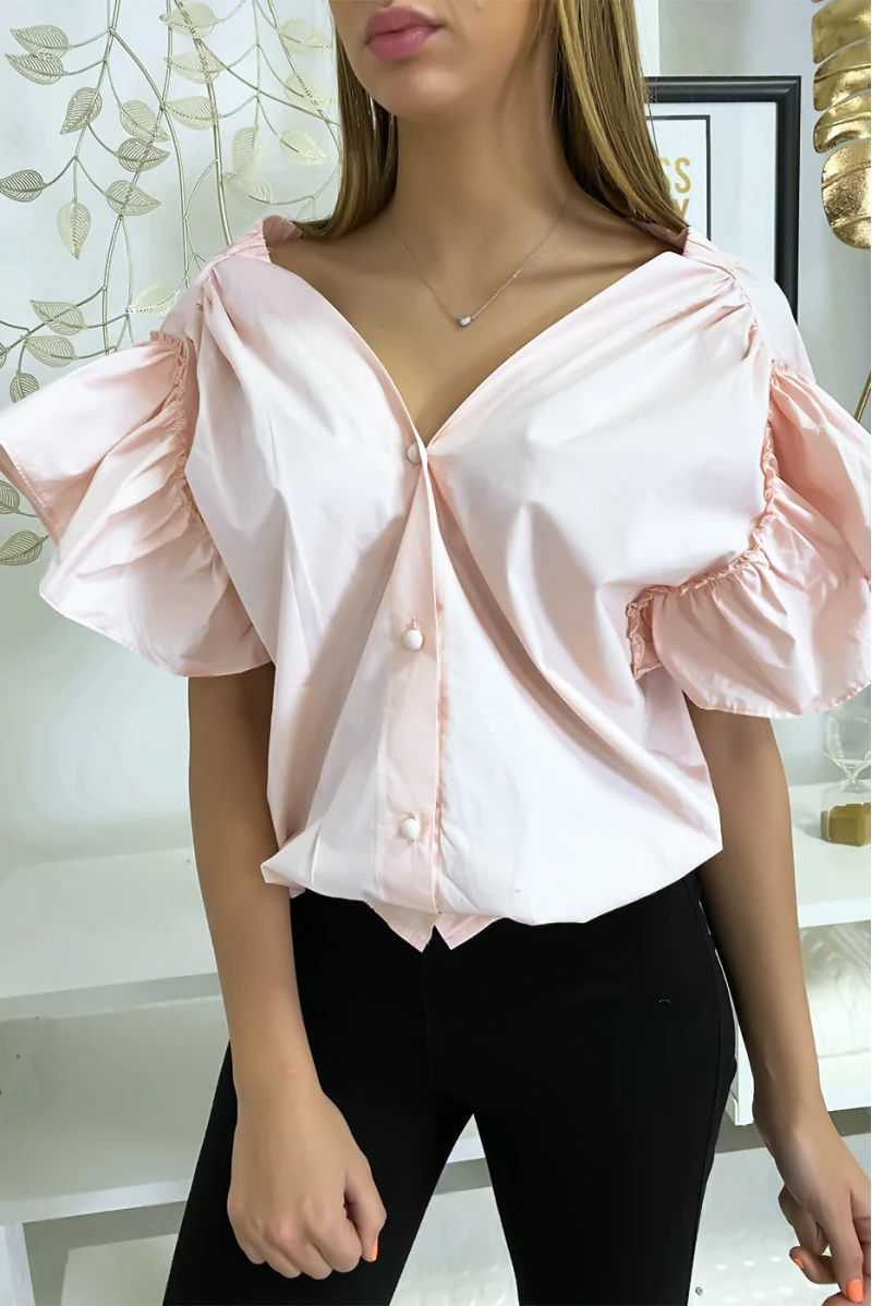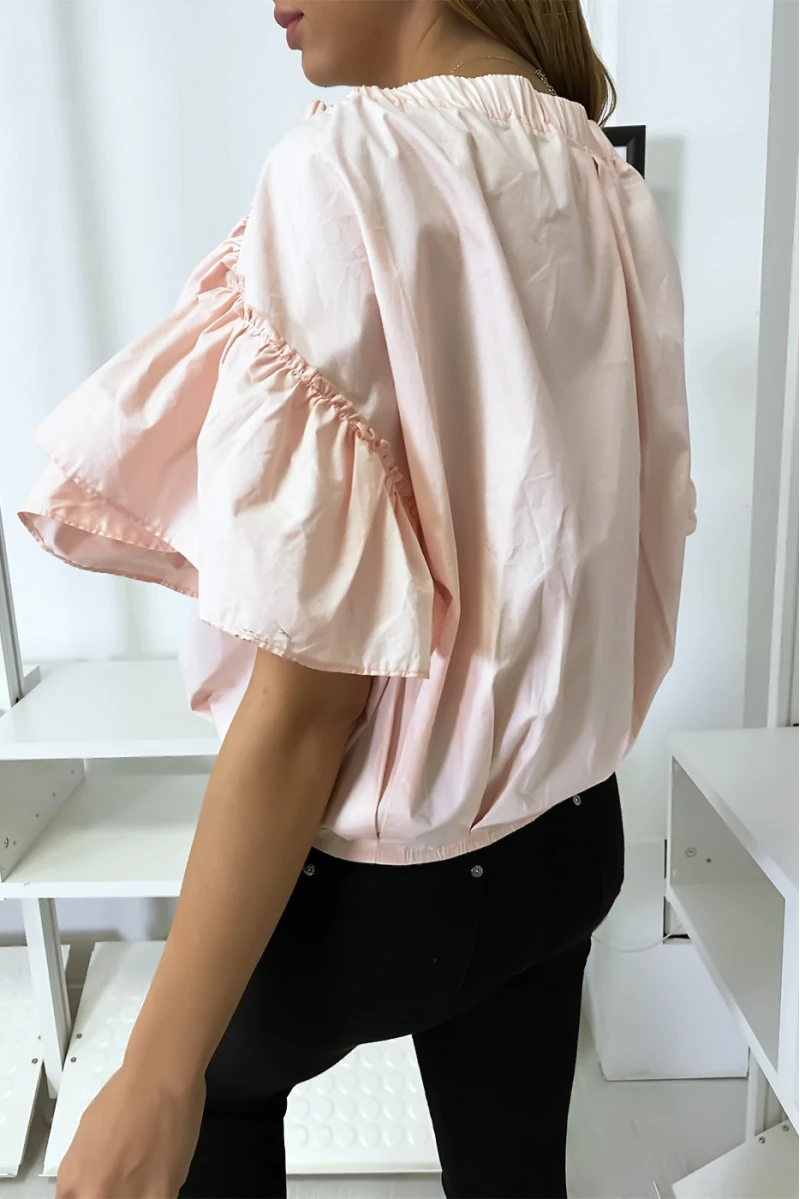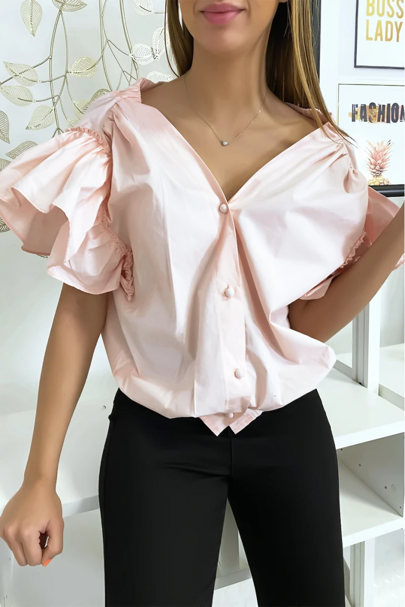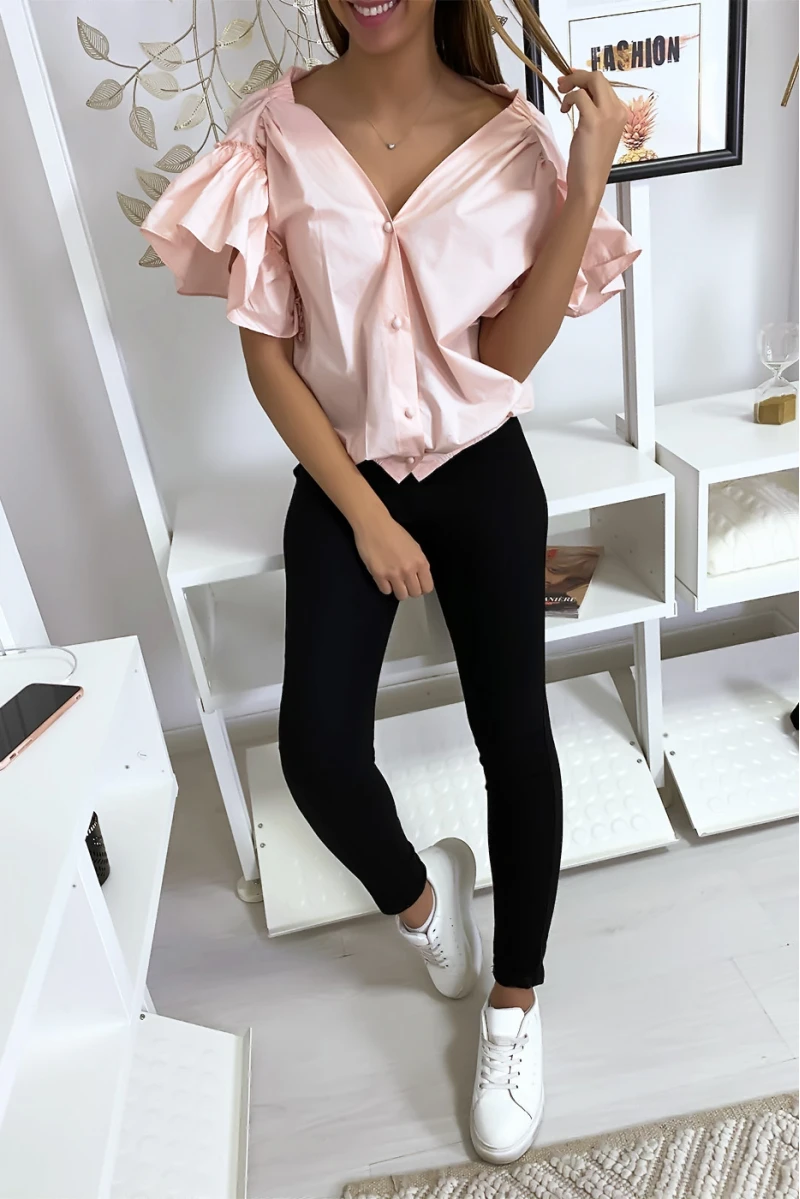 Blouse chemise rose pour femme boutonnés à l’avant avec volant aux manches et fronce aux épaules. Prêt à porter mode femme pas cher