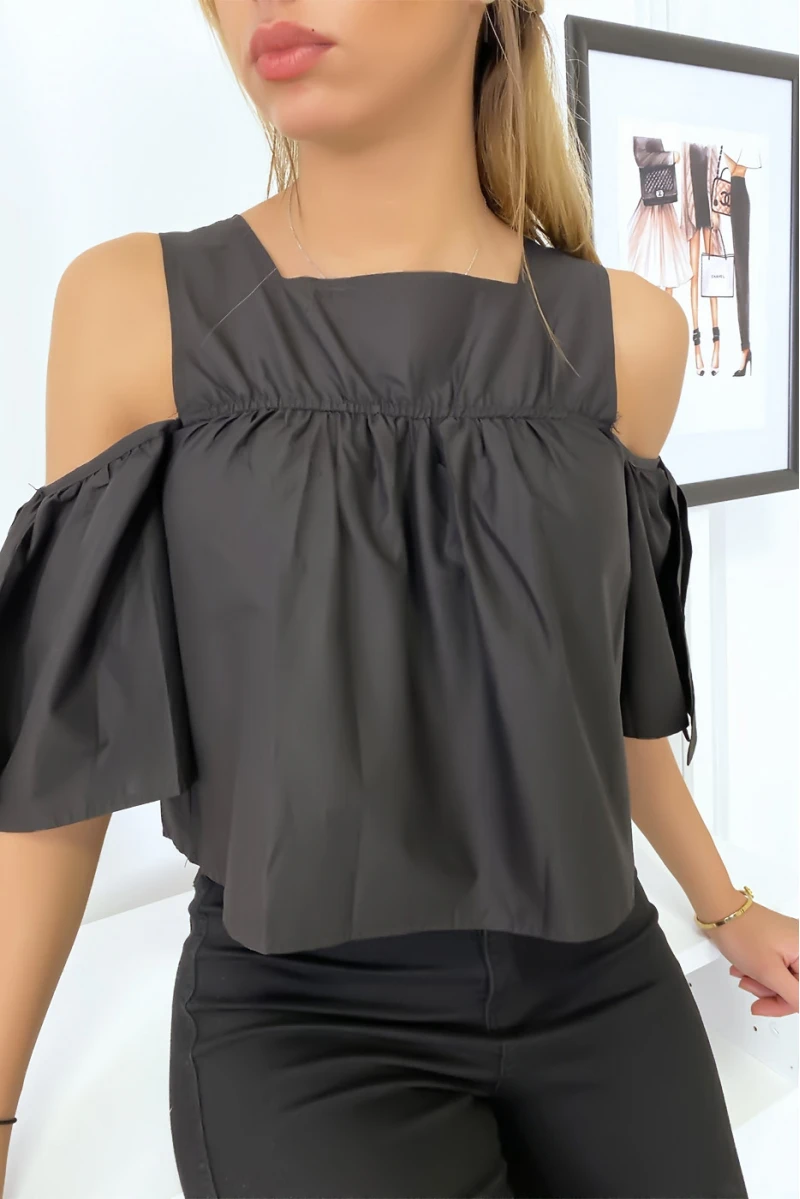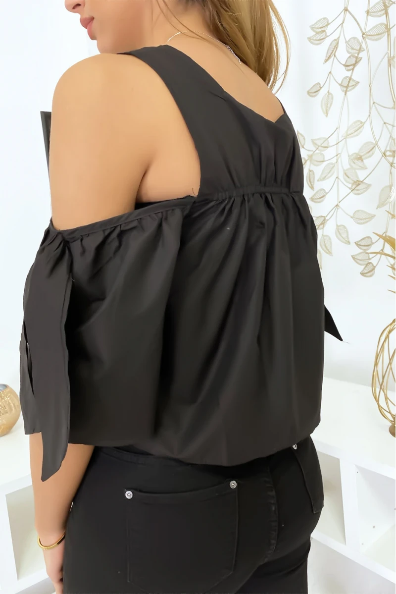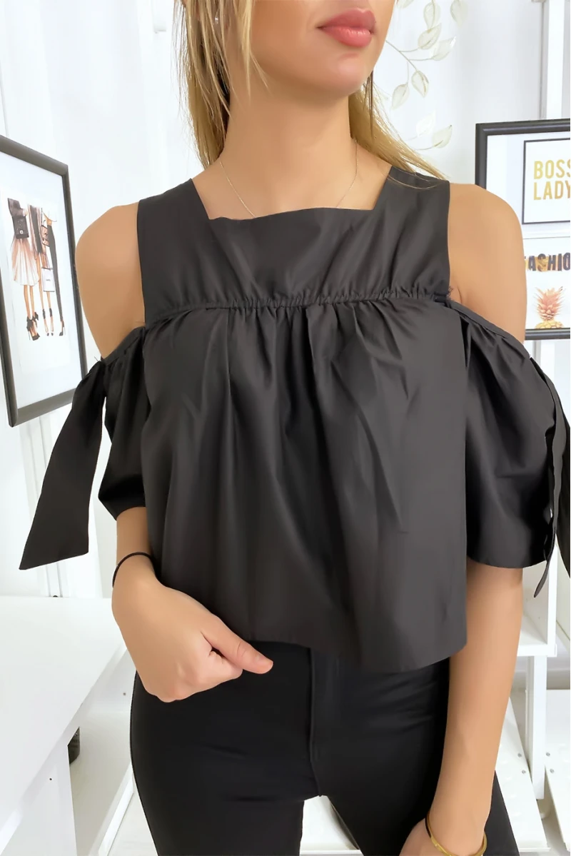 Blouse crop top noir avec noeuds. Joli top léger pour les dernières tendances femmes.