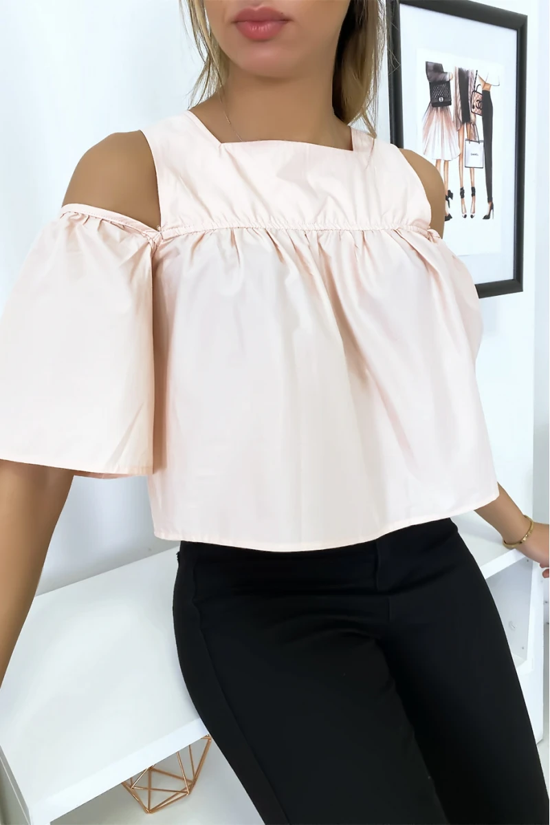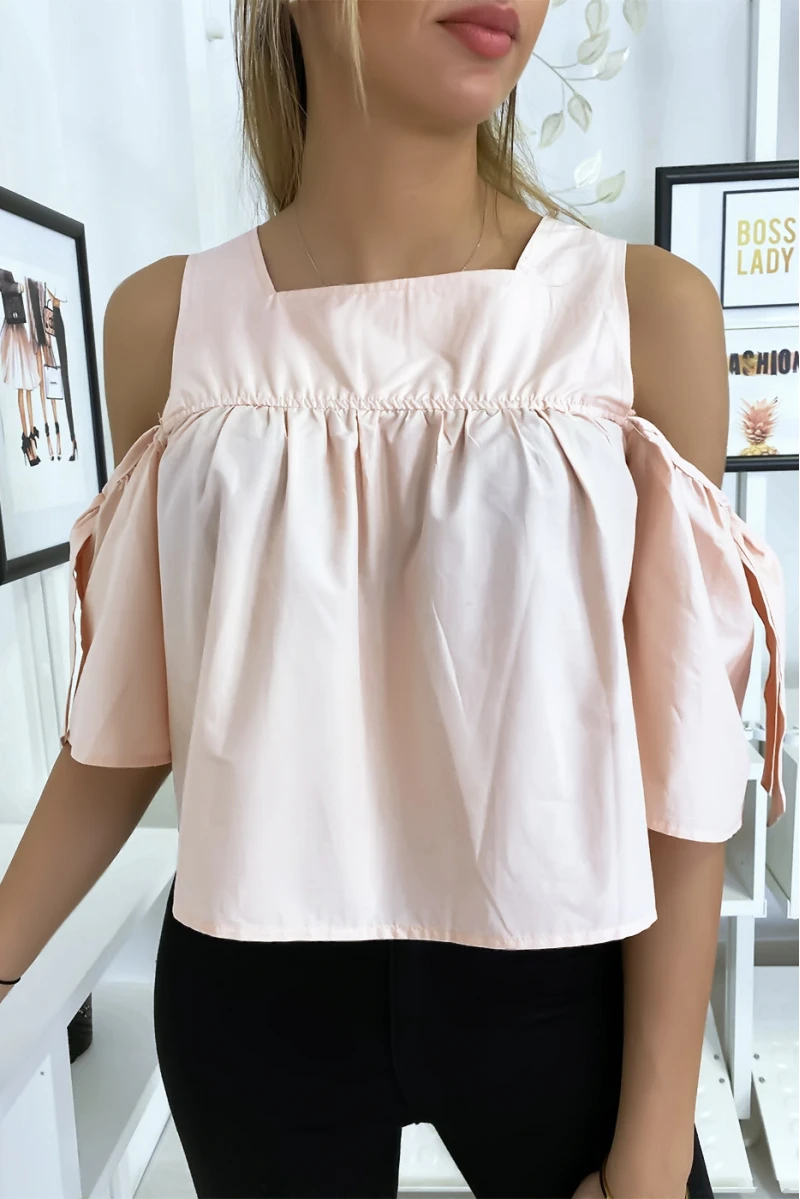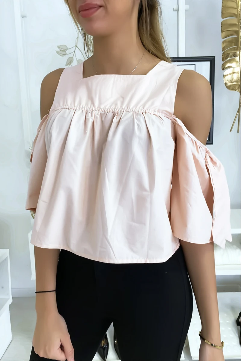 Blouse crop top rose avec noeuds. Joli top léger pour les dernières tendances femmes.
