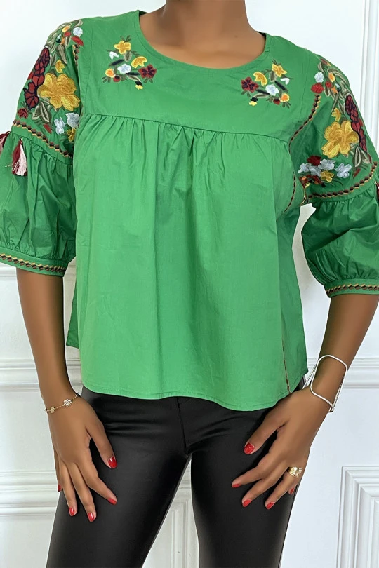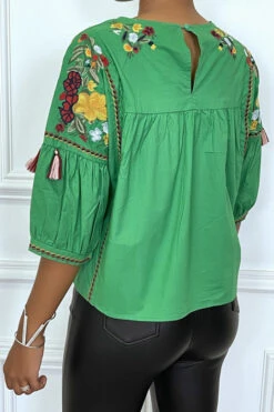 Blouse d’été vert avec détails/fleurs brodés et pompons, à manches mi-longues et col rond. Très tendance et idéal pour l’été ce haut est le nouveau basique à posséder. Agréable à porter.