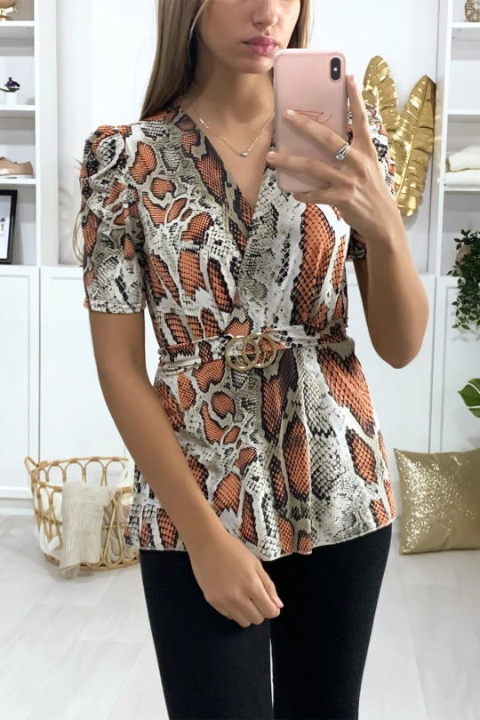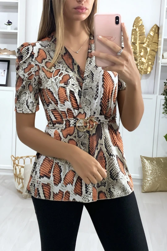 Blouse Fuchsia à motif python et ceinture à boucle.