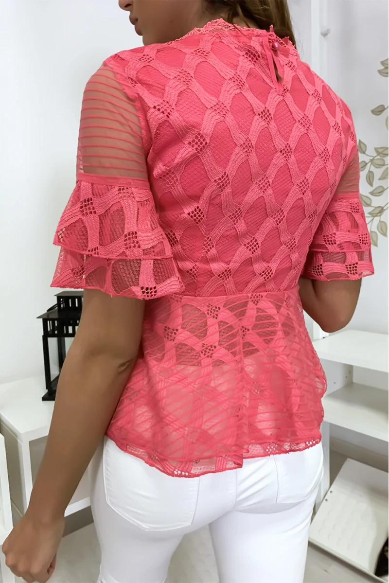 Belle blouse femme en fuchsia avec de jolis motif en dentelle et des volants aux manches et en bas