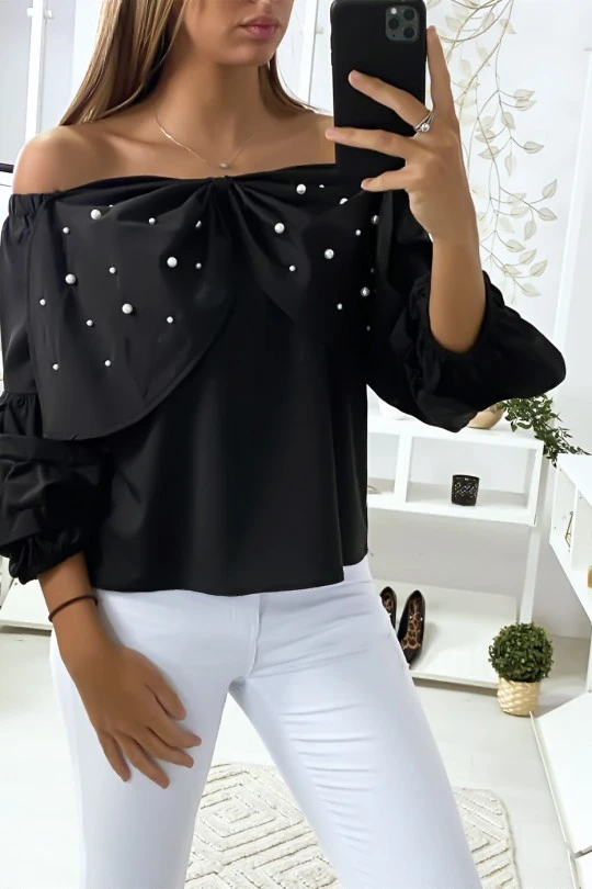 Blouse femme très chic en noir avec papillons ornée de strass à l’avant