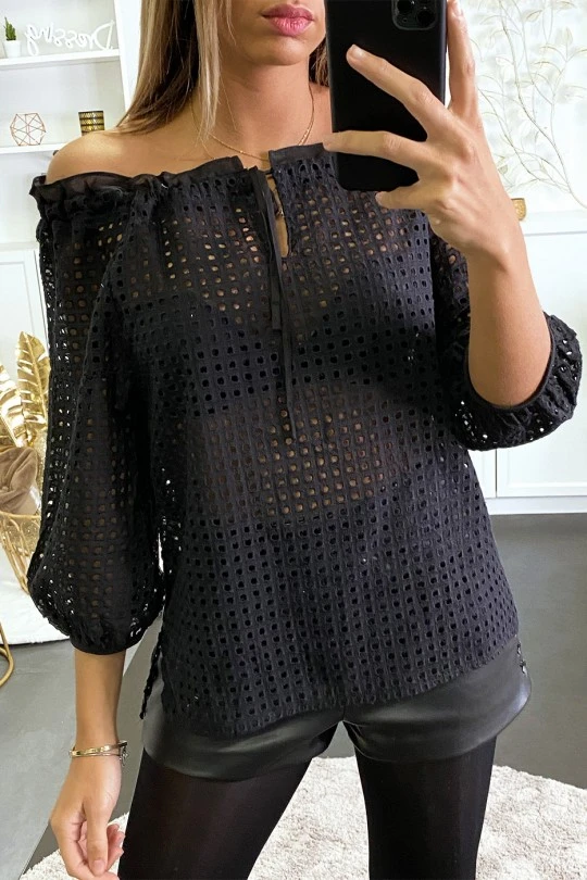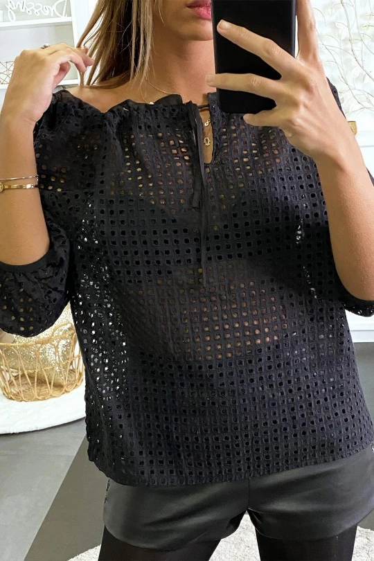 Blouse noir en dentelle col bateau avec lacet. Mode femme fashion et tendance