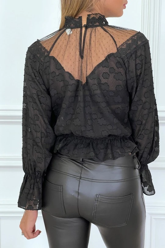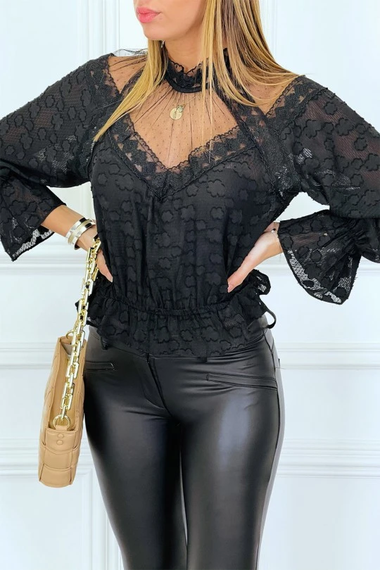 Blouse noire en dentelle à col haut avec élastique à la taille et manches, blouse dentelle très tendance idéal avec un pantalon jeans ou un pantalon slim
