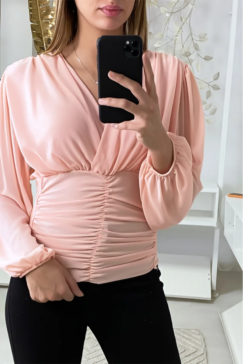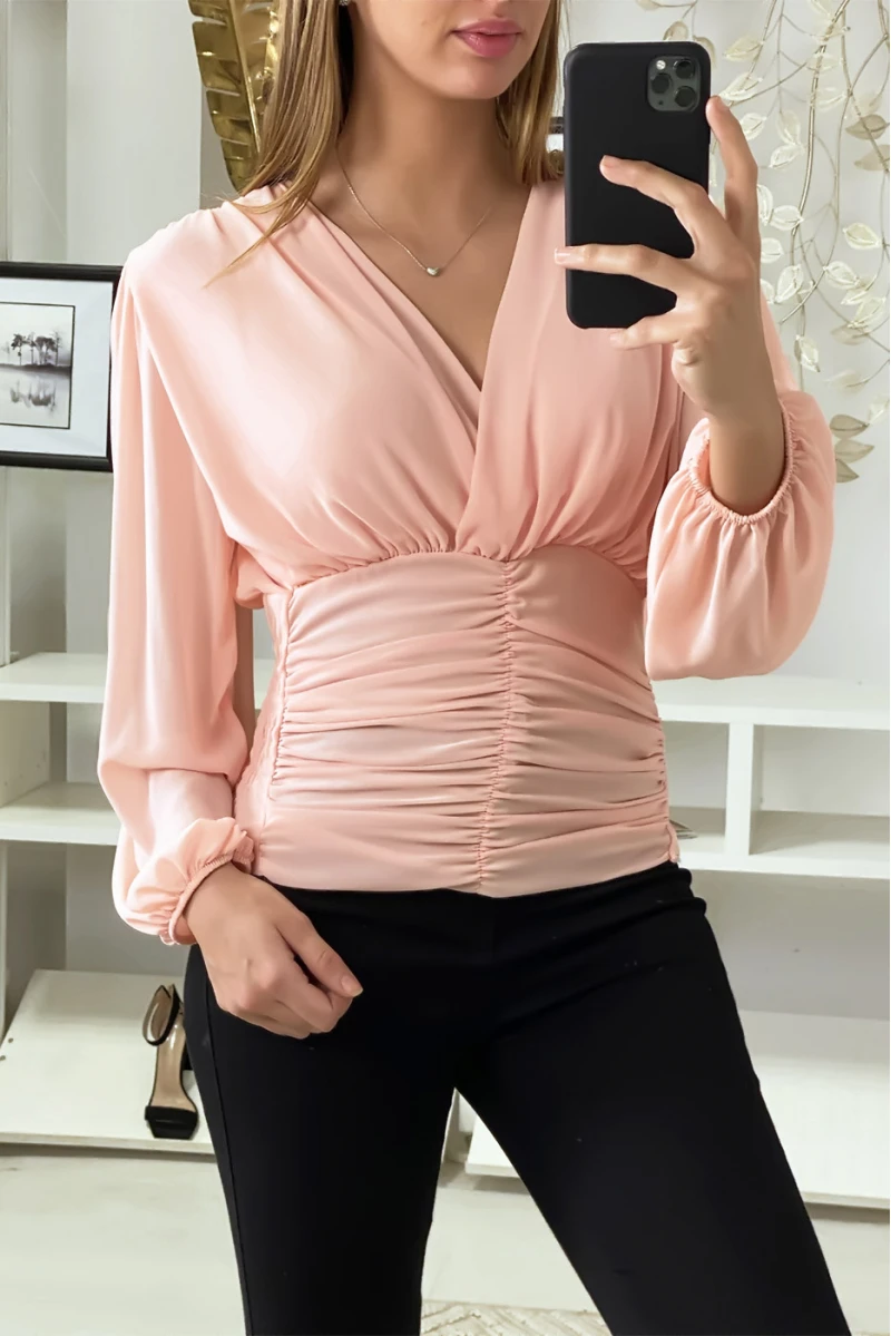 Blouse femme rose très chic croisé au buste et cintré à la taille. Vêtement femme pas cher