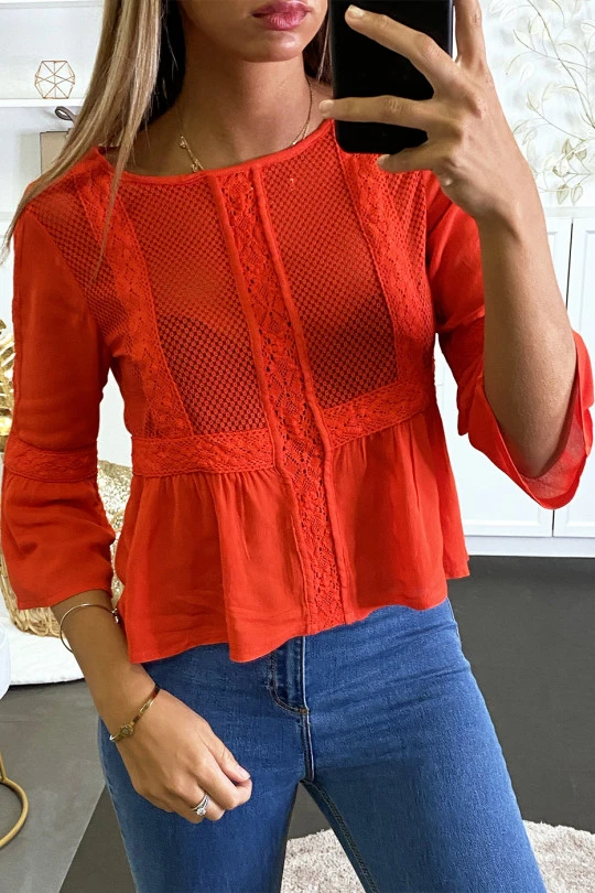 Superbe blouse à dentelle sur le devant, manches à volants et petites détails en crochet