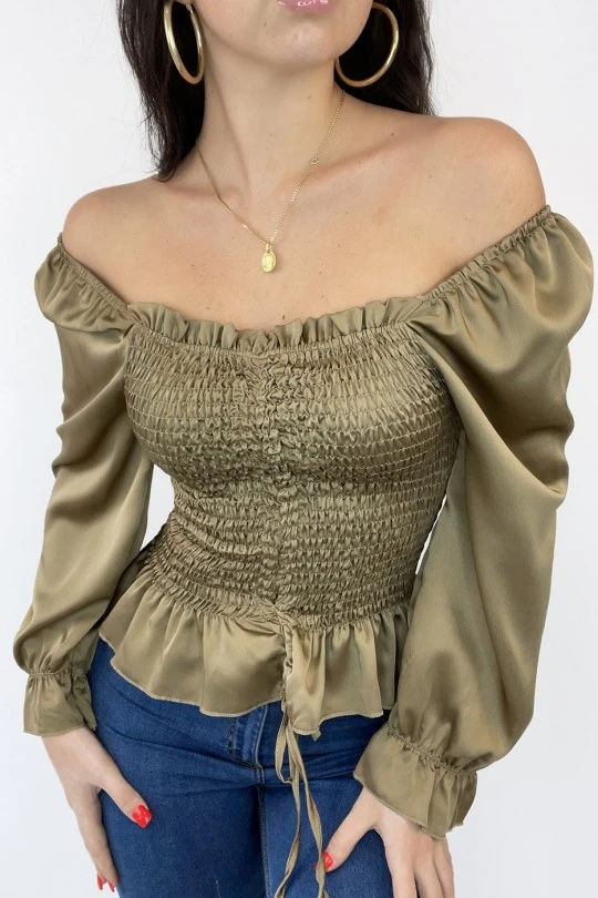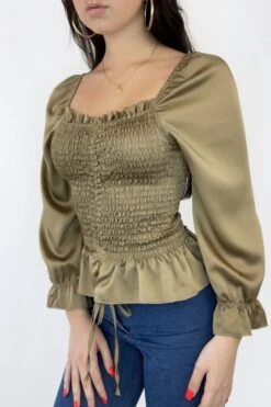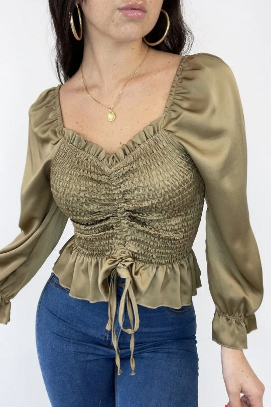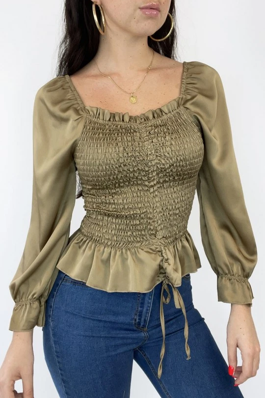 Blouse satiné en camel froncé avec noeud ajustable. Blouse femme tendance et fashion nouvelle collection