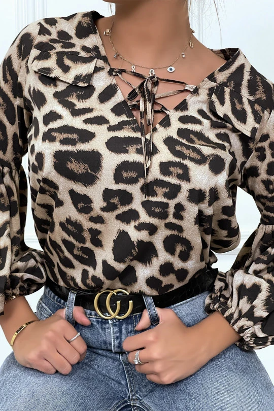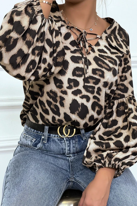 Blouse taupe imprimés léopard, à manches bouffantes. Une pièce agréable à porter qui saura embellir vos tenues.