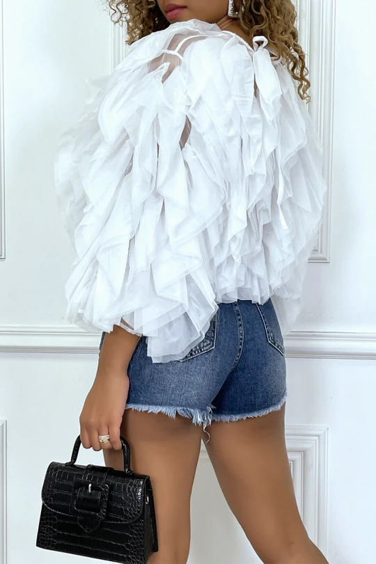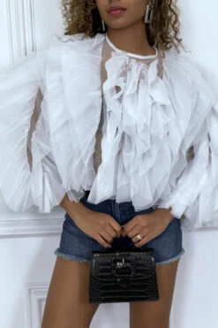 Blouse transparente blanche à manches longues, avec volants en tulle. Cette ravissante blouse saura vous mettre en valeur à n’importe quel moment.