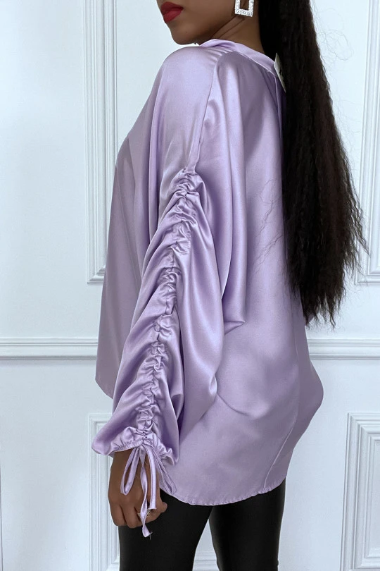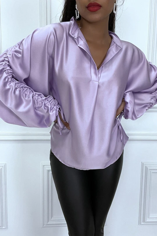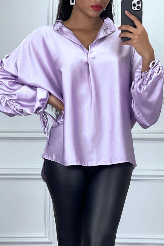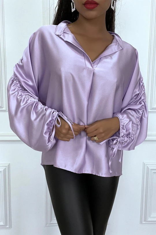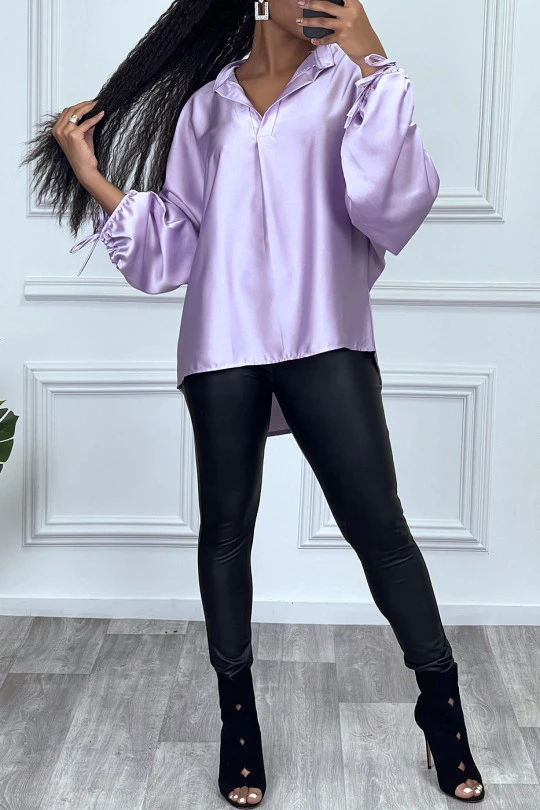 Blouse violette satinée à manches bouffantes retroussables, col claudine ouvert