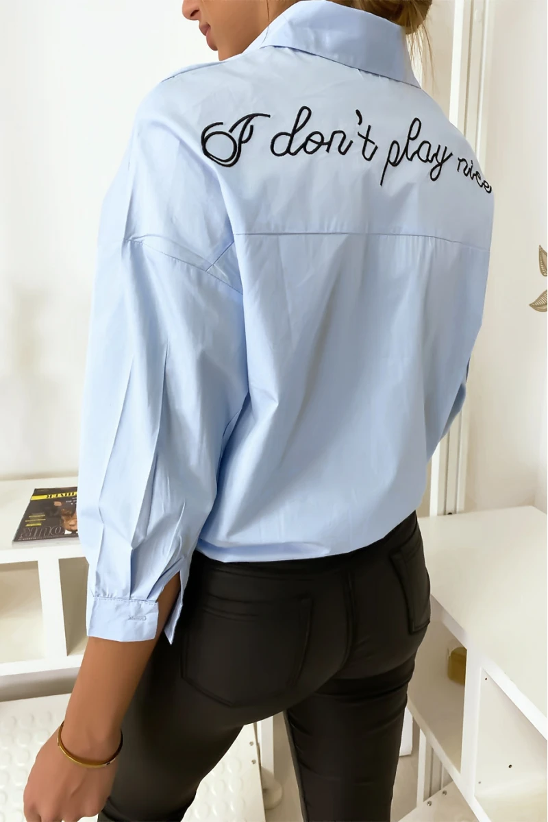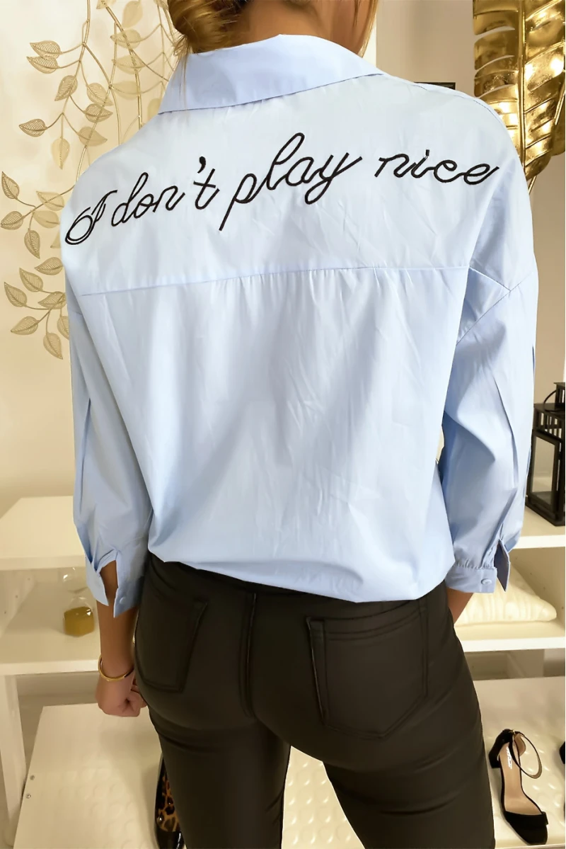 Chemise bleu abeille sur la poche à nouer et inscription « I don’t play nice » dans le dos. Jolie tendance femme.