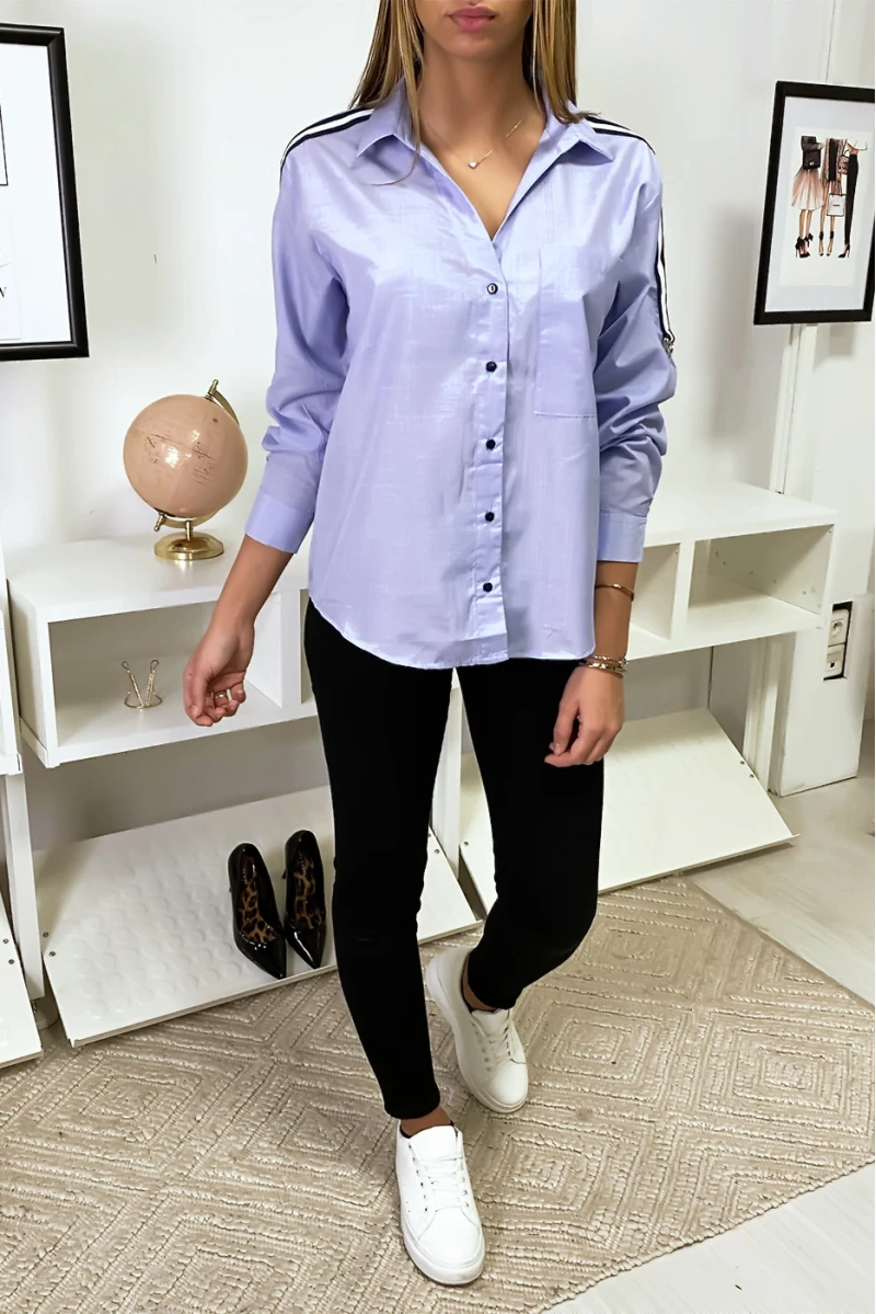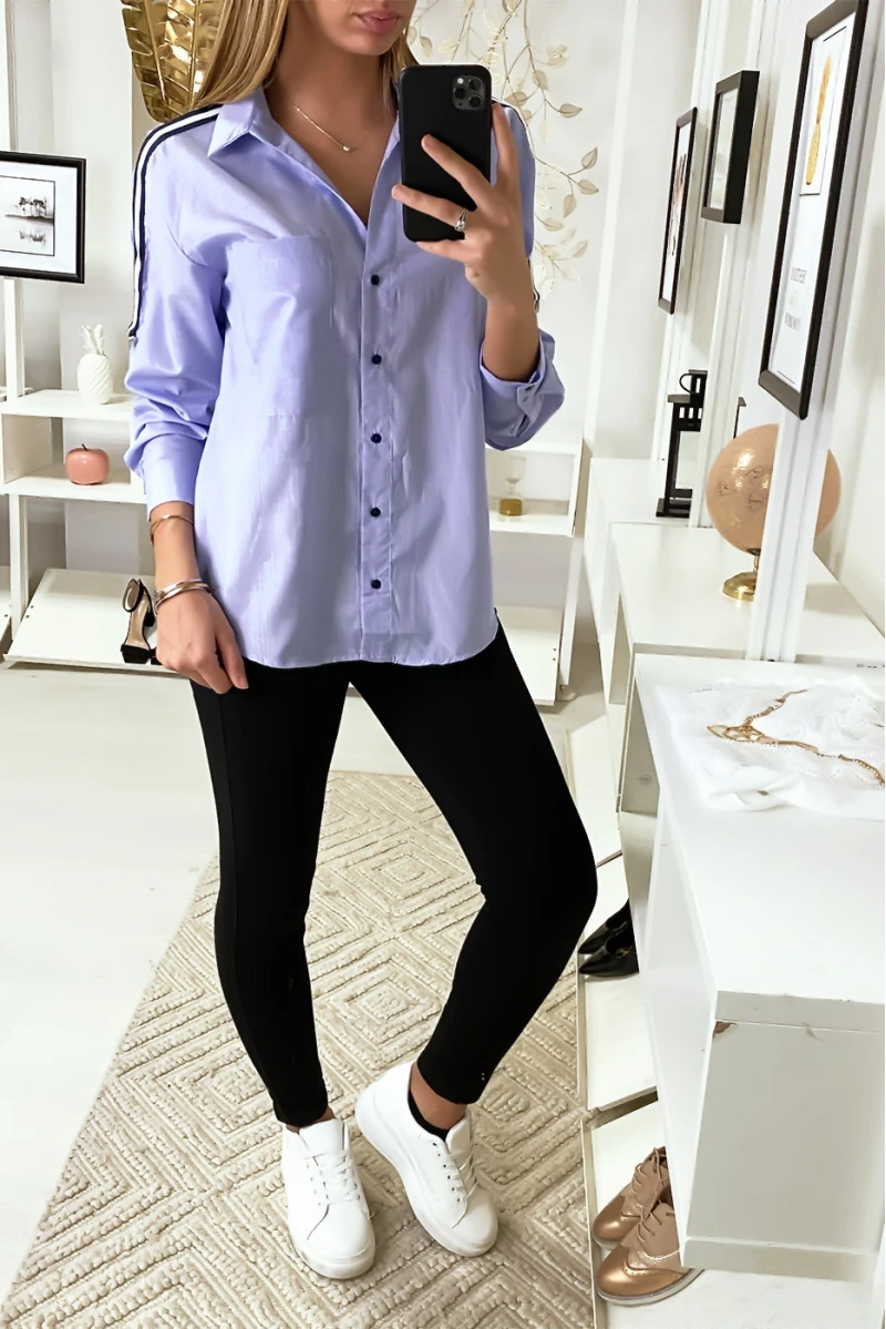 Chemise Bleue à bande rayé sur épaules. Effet oversize, la chemise est un incontournable de votre garde robe.