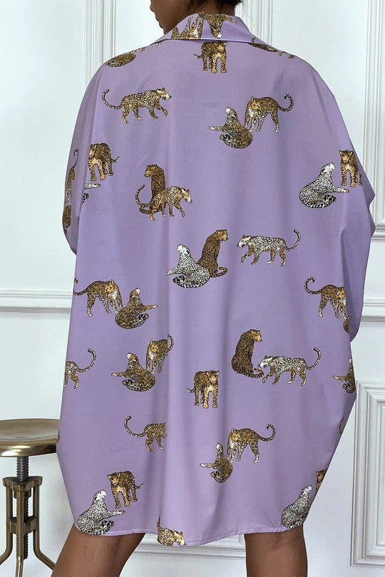 Chemise lila longue à l’arrière, imprimés léopard avec manches amples. Agréable à porter, rajoutez une touche de fantaisie à vos tenues.