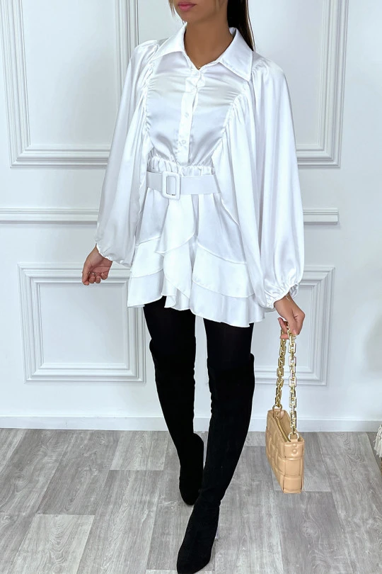 Chemise satiné blanche avec manches large ceinture et volant. Sublime chemise femme très classe dans une belle matière satiné et tombante avec des volants une ceinture et de grosse manches bouffante style chauve souris