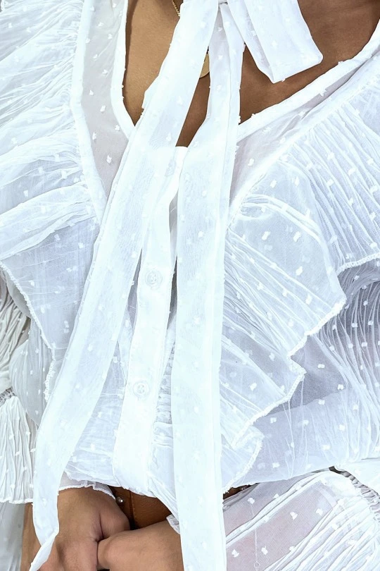 Chemisier blanc en voile à plumetis, volants, et col lavallière, de super manches bouffantes très chic, ce chemisier est un atout garantie pour vos tenues élégantes.