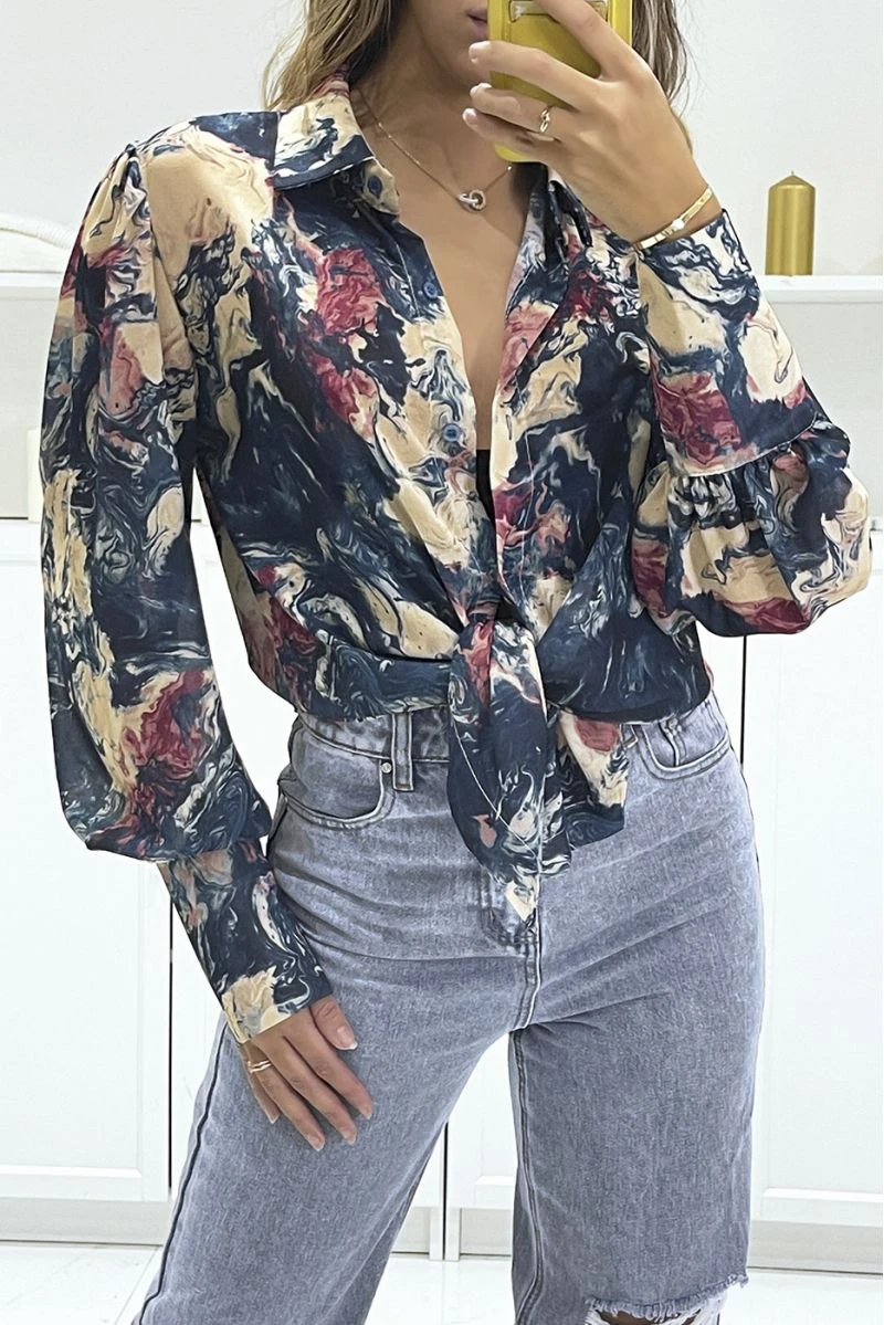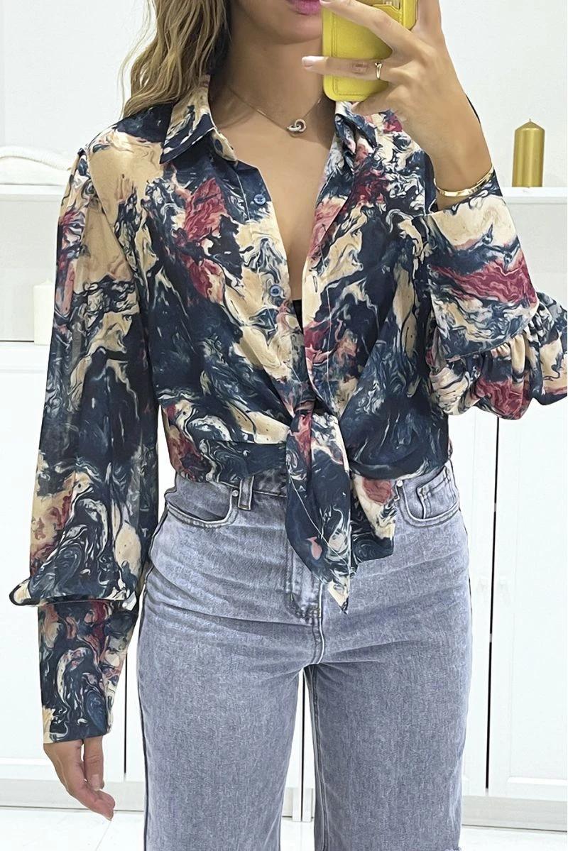 Chemisier bleu en voilage avec imprimé abstrait avec nœud