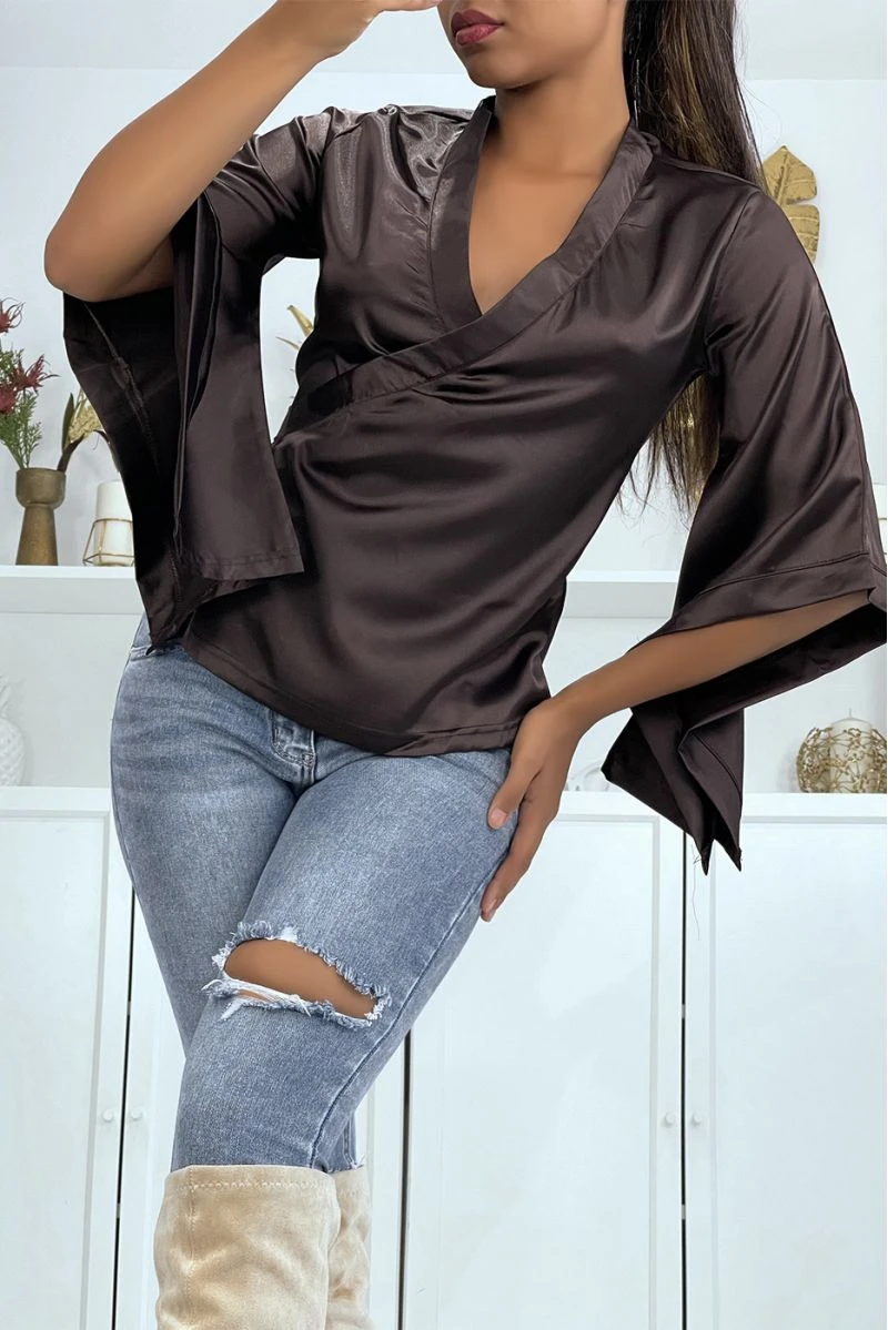Mega destockage Chemisier cache coeur Marron satine a manches trapezes. Chemisier Chic. 20