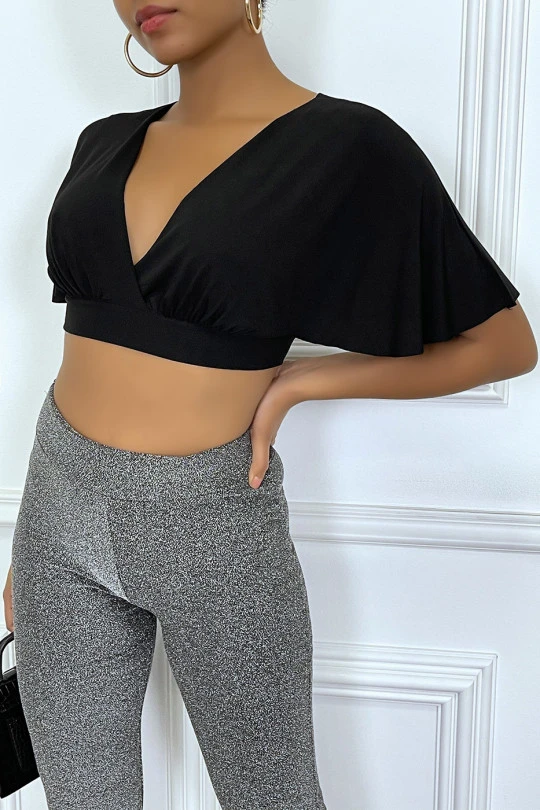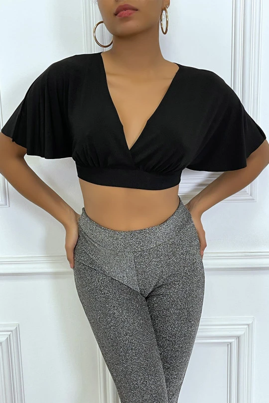 Crop blouse noir à manche volant et col plongeant