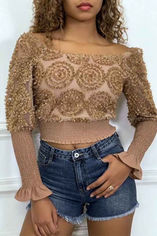 Crop top camel manches longues à froufrous