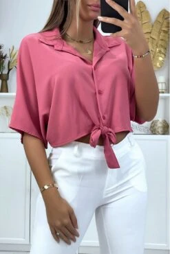 Crop top chemise fuchsia avec noeud et élastique au dos
