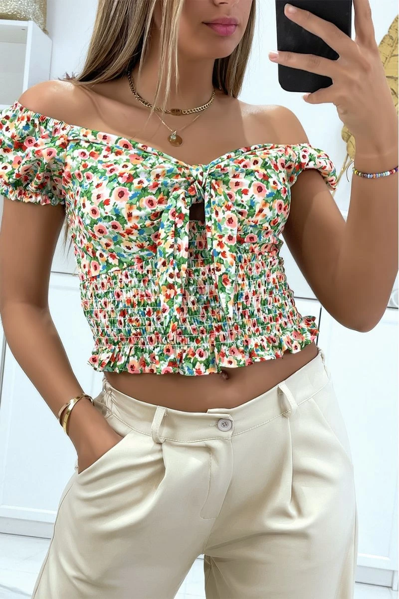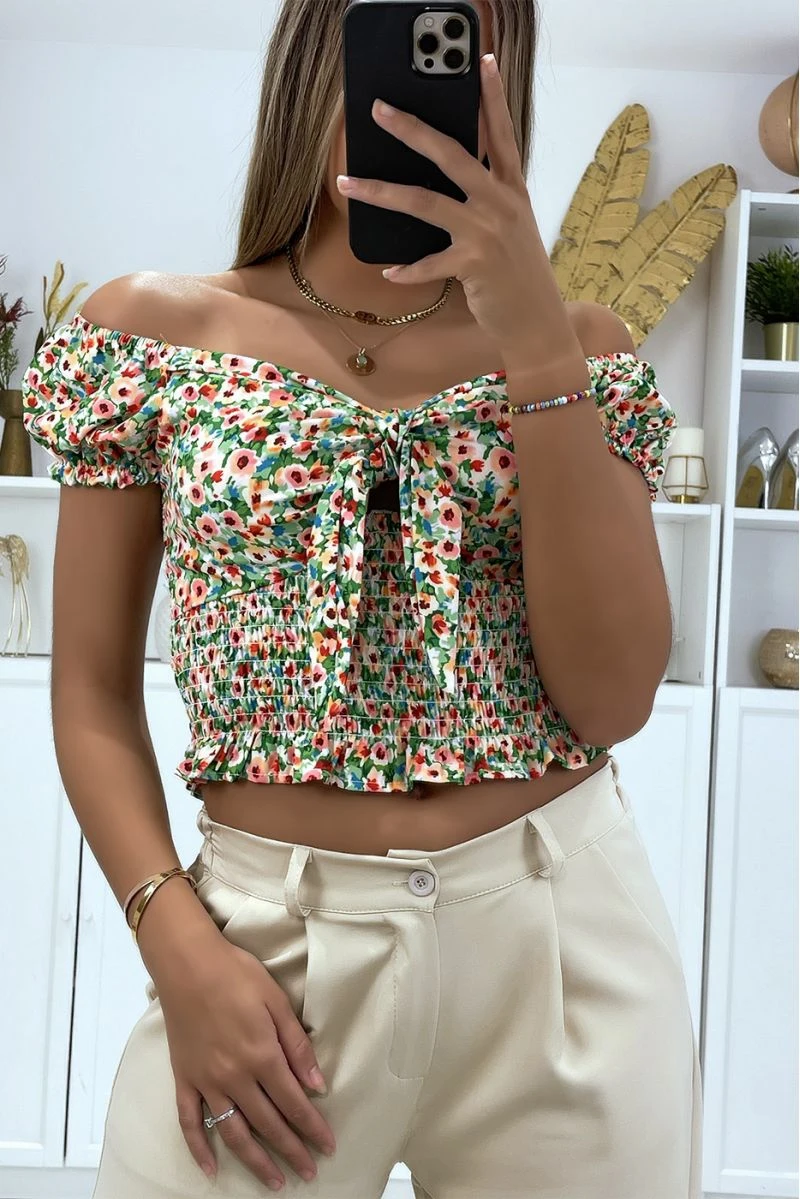 Crop top col bateau motif fleuris vert avec noeud