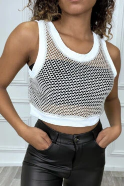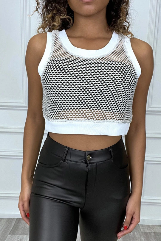 Crop top écru en maille avec fil doré. Mode femme pas cher