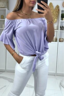 Crop top lilas col bateau avec noeud et volant aux épaules