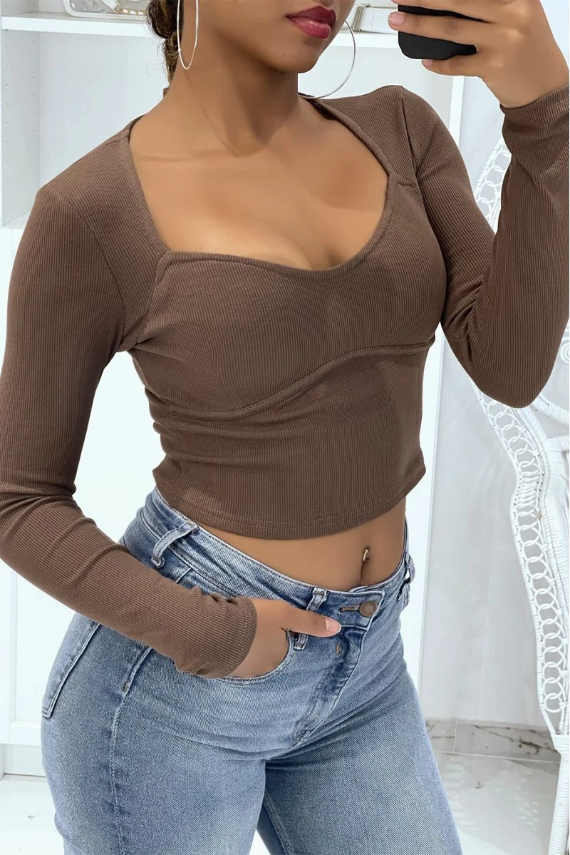 Crop top marron côtelé à col décolleté en forme de coeur, très tendance idéal avec un jean slim blanc taille haute