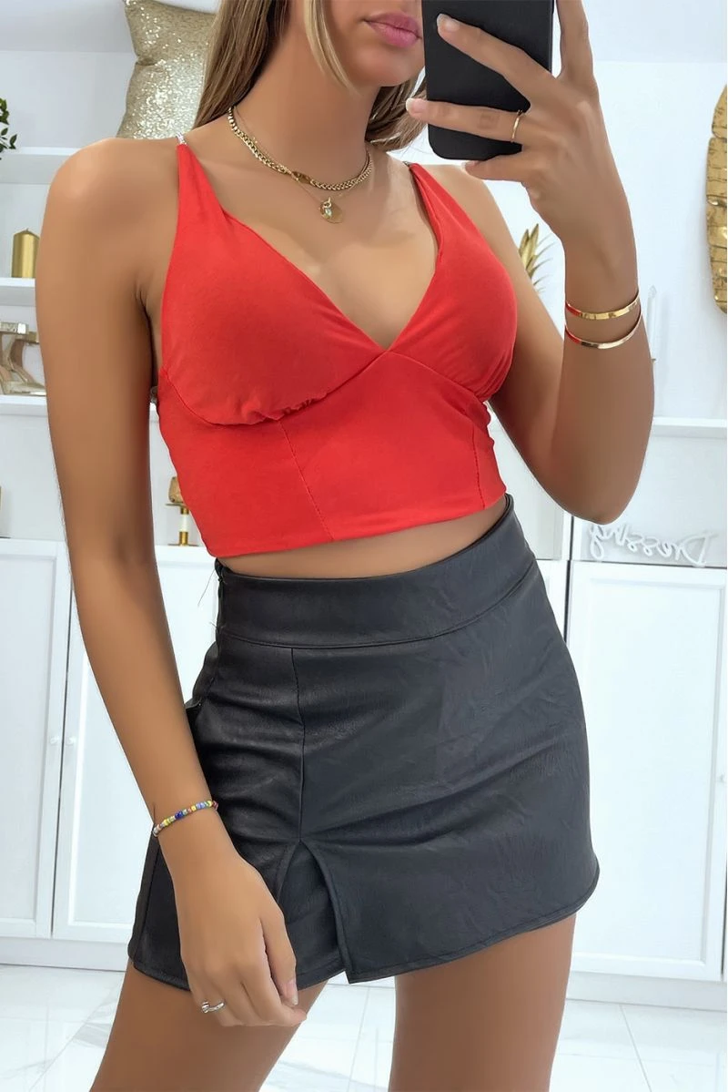 Crop top rouge brassière vol V plongeant et bretelles brillantes en argent