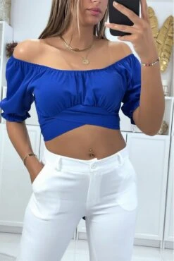 Crop top royal à col bardot croisée sous la poitrine et se noue au dos
