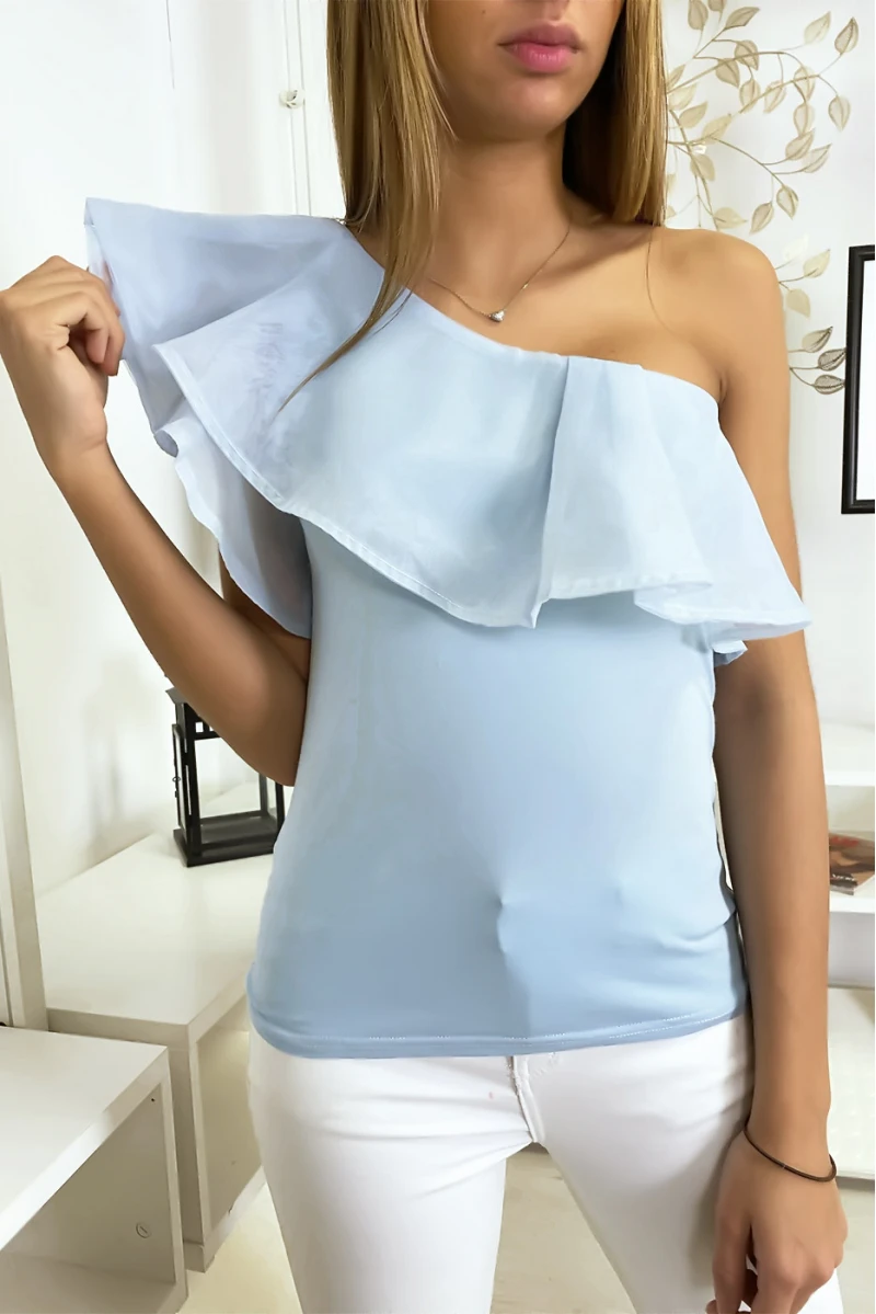 Joli haut turquoise très chic croisé avec volant. Mode femme pas cher