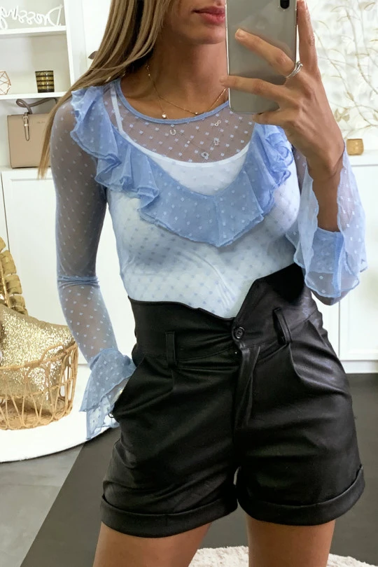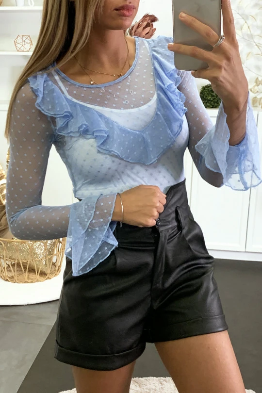 Haut en résille turquoise avec motif pois et volant. Vêtement mode et top femme fashion et pas cher