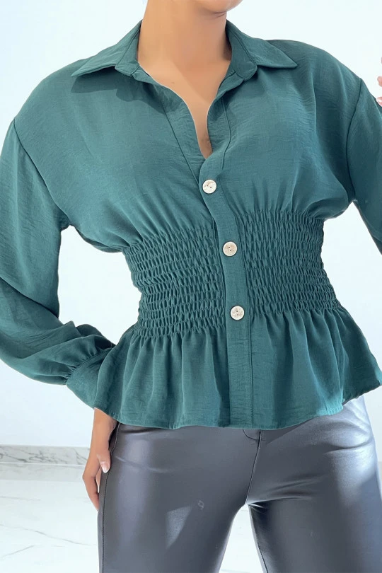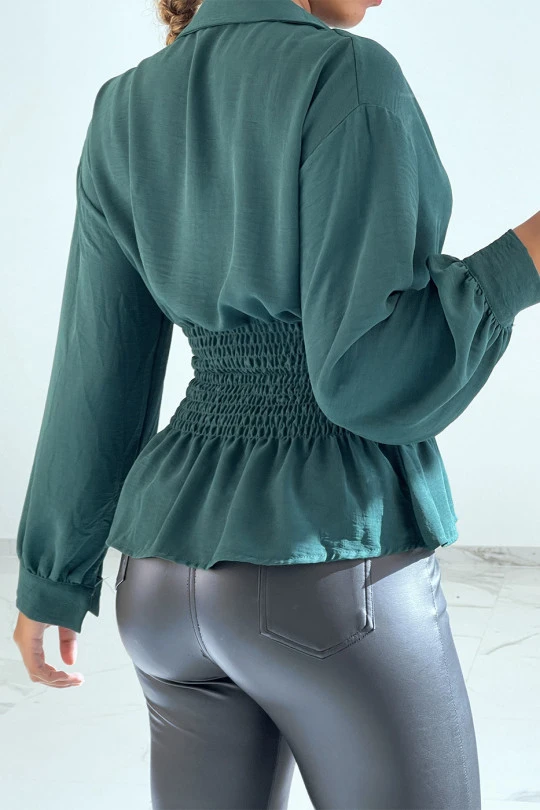 Haut fluide vert cintré à la taille effet bouffant style bohème chic. Blouse courte effet chemise d’été.