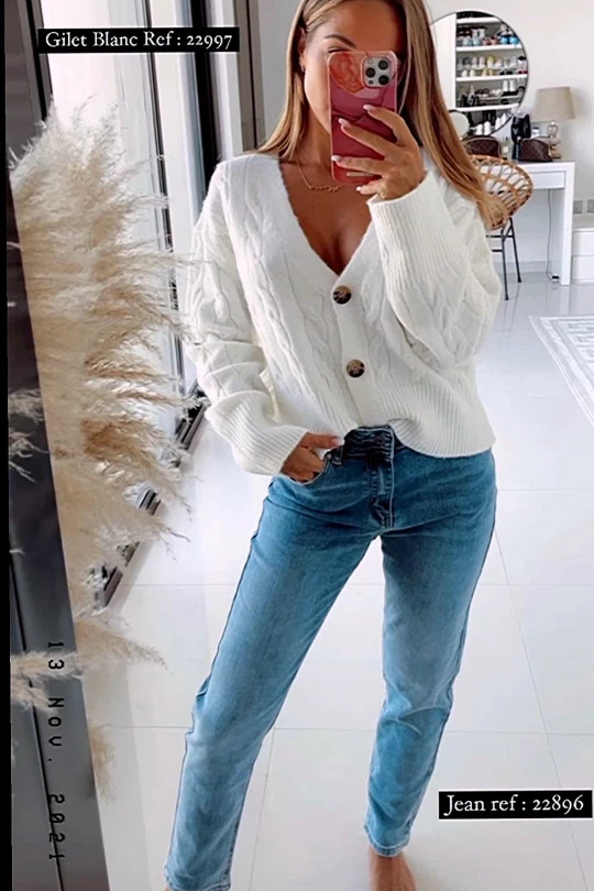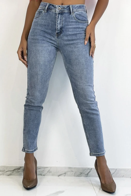 Jean bleu clair taille haute effet boyfriend cintré à la taille avec poches arrières. Ce jean hyper tendance est un indispensable de super qualité, sa coupe droite boyfriend met en valeur votre taille, crée un effet push up sur les fesses et donne un effet de jambes allongés! Il s’accordera aussi bien avec un sous pull simple qu’avec un pull à motif, avec une belle paire de basket autant qu’à de jolie escarpin, et pour vous tenir chaud pensez à porter ce jean avec un manteau en moumoute!