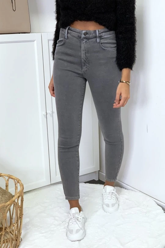 Jeans gris en taille haute très extensible avec poches. Jeans femme fashion et pas cher