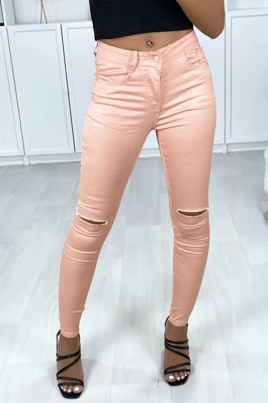 Jeans slim rose pour femme avec 5 poches déchiré aux genoux. Jeans femme pas cher tendance 2020