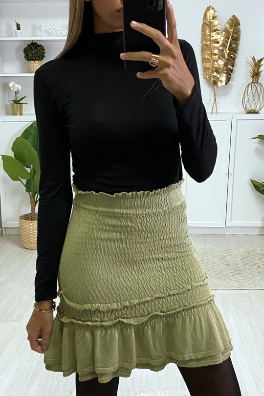 Jolie jupe kaki froncé avec volant. Mode femme pas cher