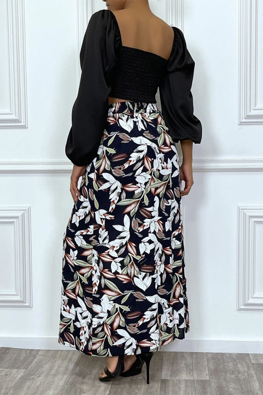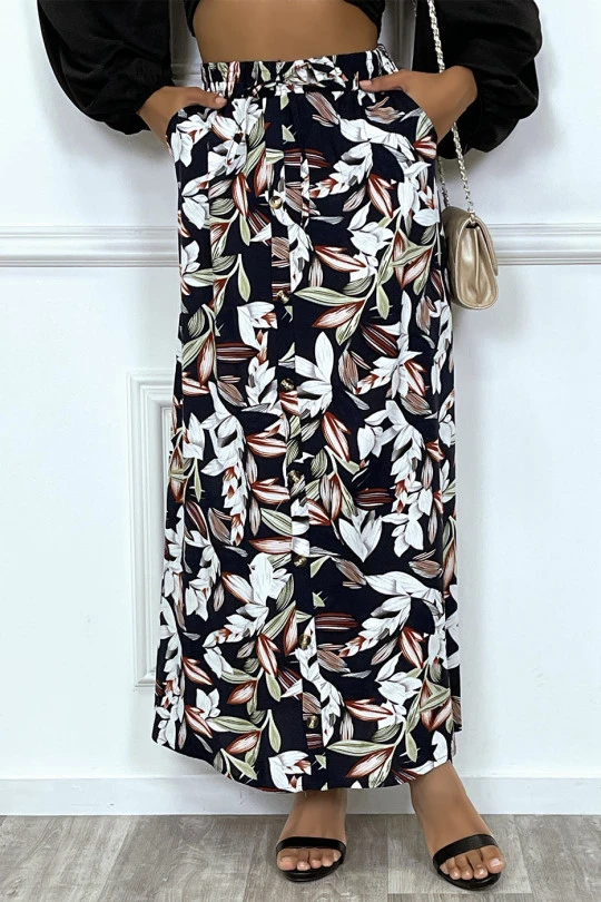 Jupe longue marine fleuri avec boutons