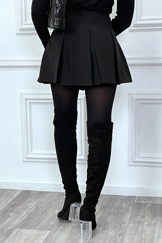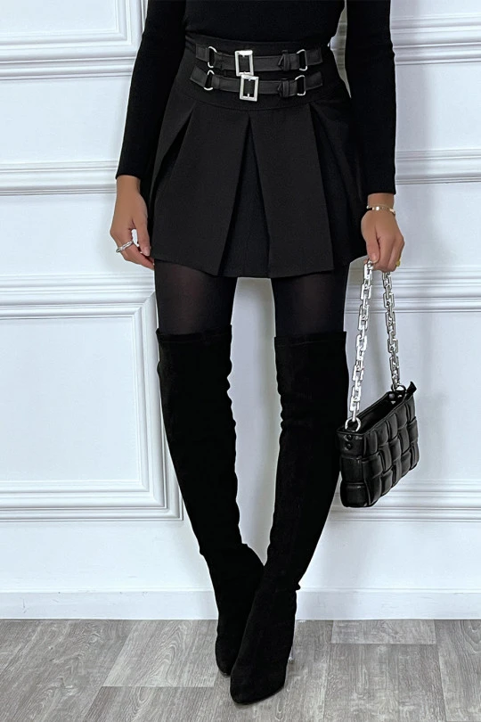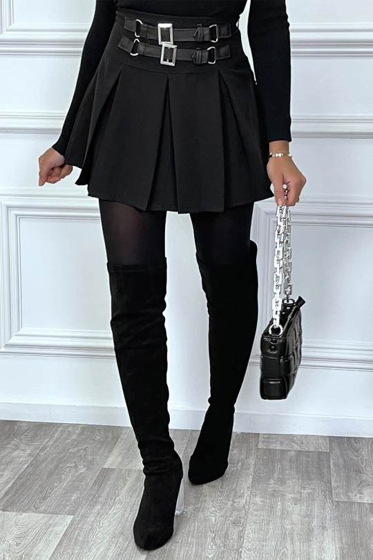 Jupe patineuse noire courte plissé à double ceintures réglables, ultra courte et resserré à la taille