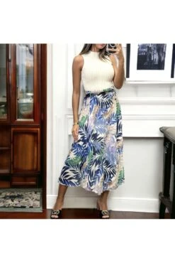 Jupe rayé à dominance vert avec plis et fermeture à l’arrière. Vêtement femme pas cher
