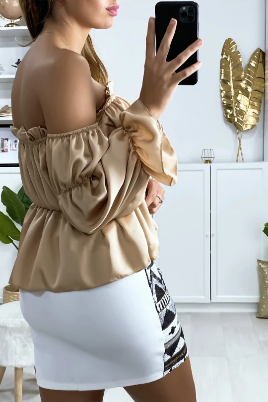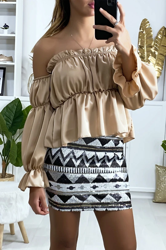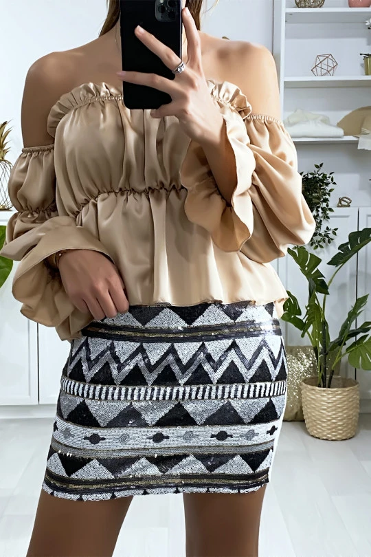 Mini jupe pailleté à l’avant avec motif à dominance noir. Mode femme tendance et festive