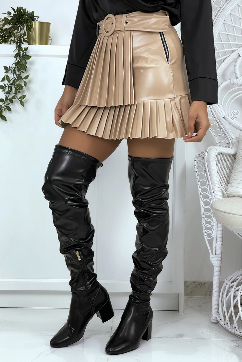 Mini jupe plissé beige avec ceinture. Jupe fashion pas cher. Femme