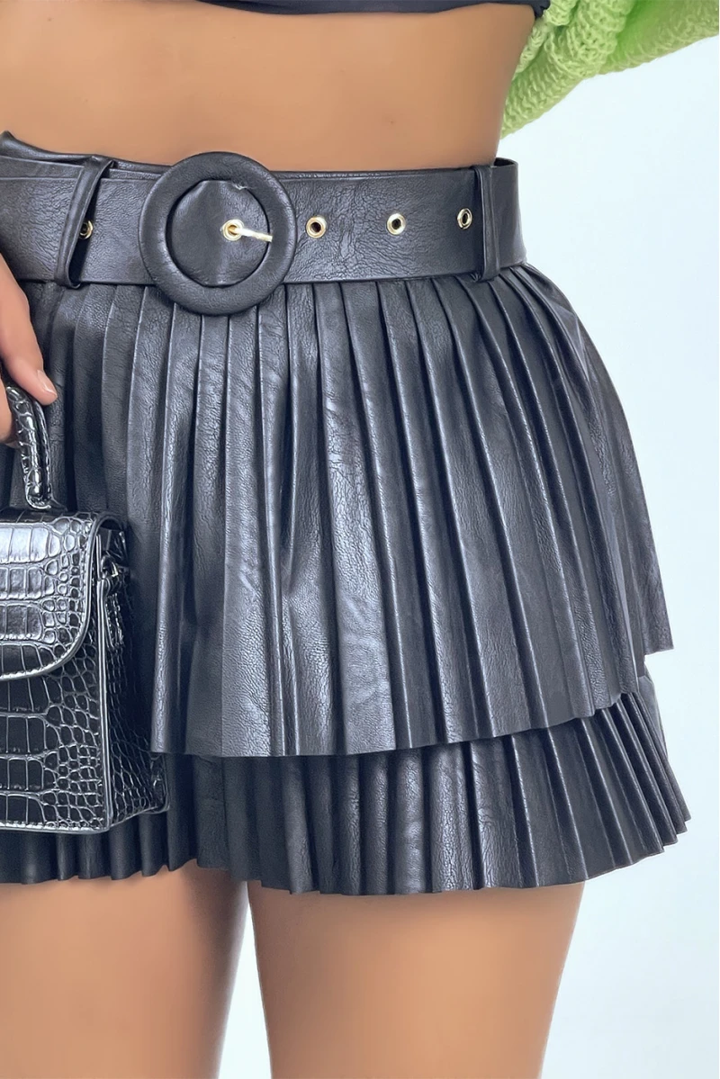 Mini jupe plissé en simili noire avec ceinture. Jupe tendance et pas cher Femme