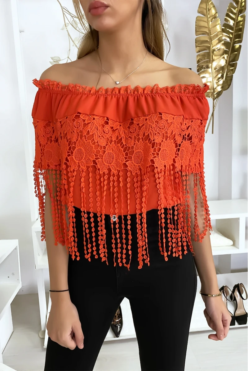 Top bardot rouge à dentelles à porter avec pantalons, legging, jupe, short… pour toutes les occasions.