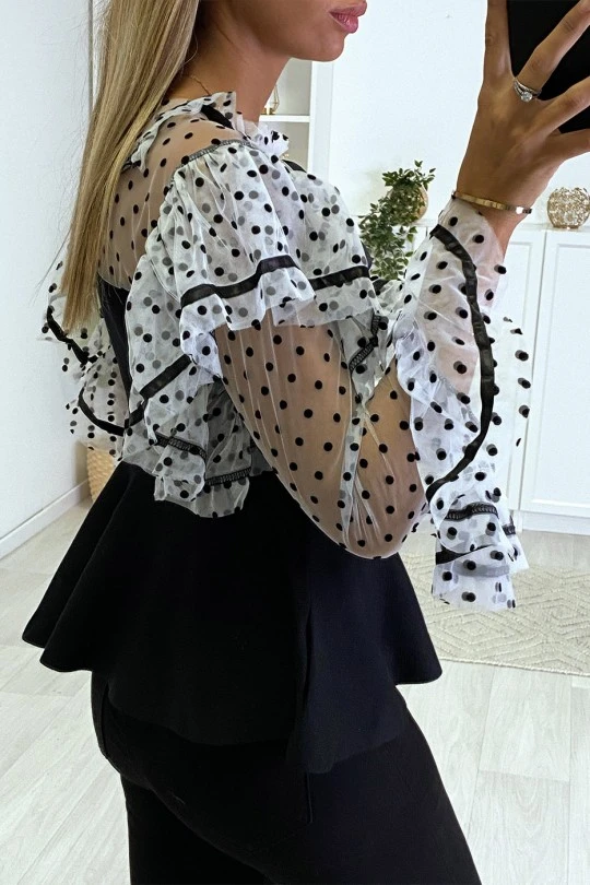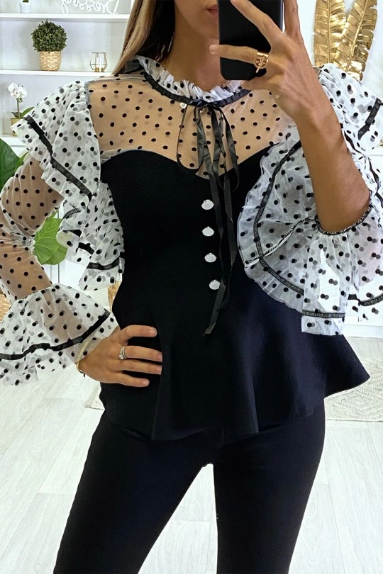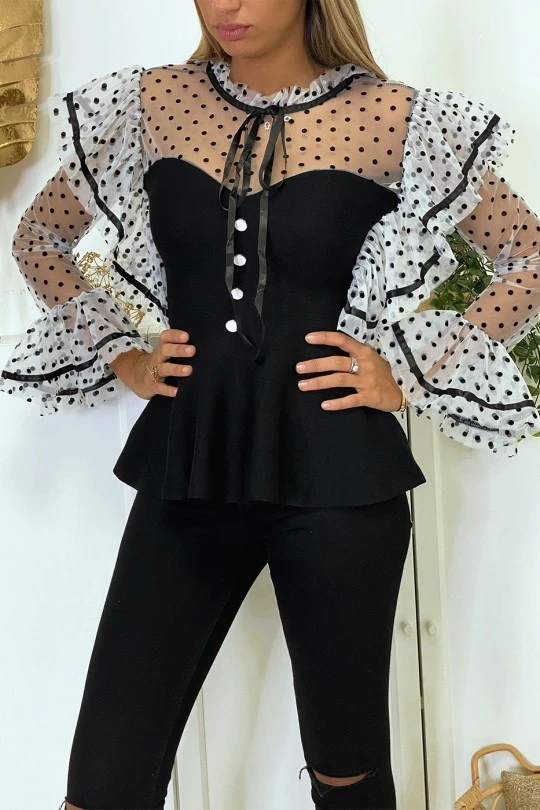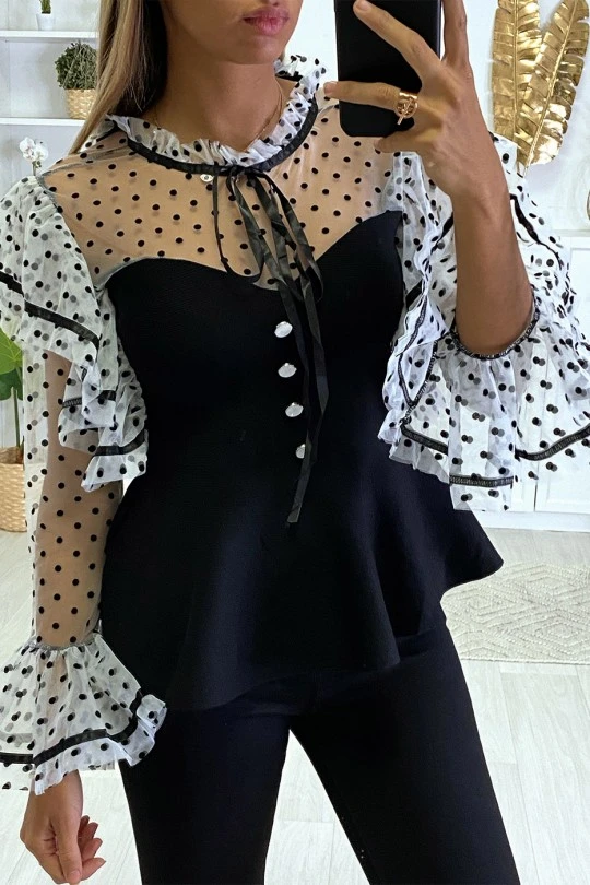 Top noir super chic à petit pois , vetements pour femmes à la mode et pas cher .