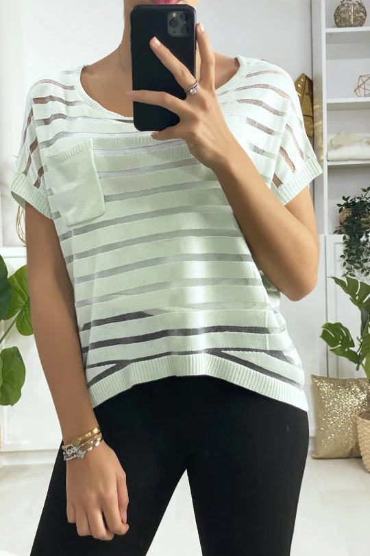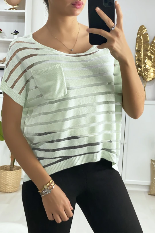 Top rayé vert pour femme semi transparent avec poche. Vêtement mode femme